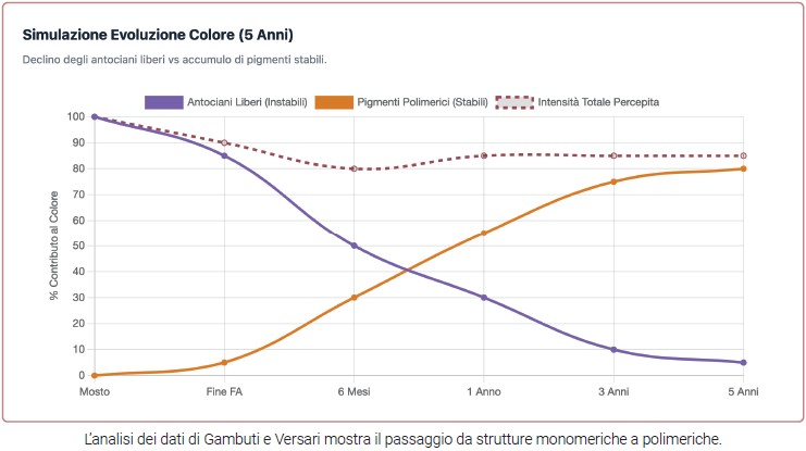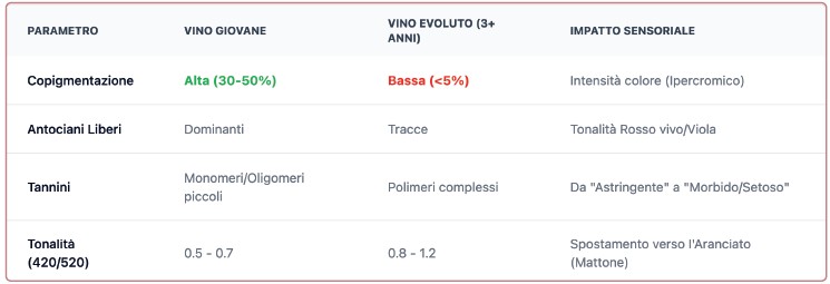 Perché, allora, i grandi rossi mantengono un colore vibrante? La risposta non risiede nella semplice quantità di pigmento, ma in complesse dinamiche molecolari: la copigmentazione nei vini giovani e la polimerizzazione in quelli invecchiati.