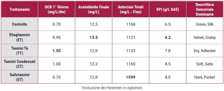Proteggono dall’ossidazione immediata, ma inibiscono la formazione di colore stabile. - Ellagitannini (Catalizzatori): mostrano un consumo di ossigeno moderato (+35%) ma il più alto accumulo di acetaldeide (13.5 mg/L, +27% vs controllo), creando l’ambiente ideale per la condensazione antociano-tannino.